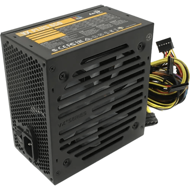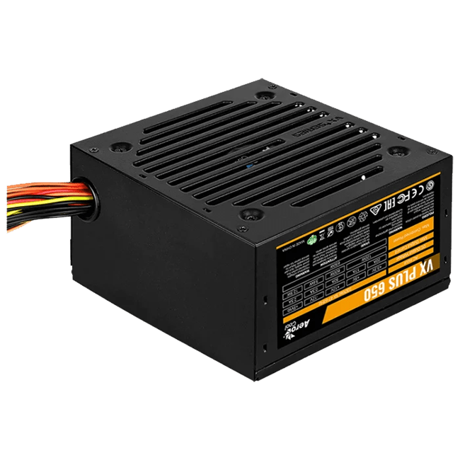 Блок питания Aerocool VX 650W PLUS [VX-650 PLUS] — необходимое приобретение для пользователя, который желает самостоятельно собрать компьютер с нуля. С помощью этого устройства другие комплектующие элементы системного блока будут получать необходимую для их бесперебойной работы электроэнергию. Модель выполнена в стандартном форм-факторе ATX, ее габариты соответствуют 140x150x86 мм (длина, ширина и высота соответственно). Оптимальная длина основного кабеля (50 см) и кабеля питания процессора (55 см) позволяет устанавливать это устройство в системные блоки с нижним расположением блока питания.