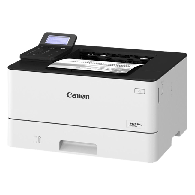 Canon LBP233dw поддерживает двустороннюю печать в разрешении 1200×1200 dpi. Благодаря интерфейсу Wi-Fi можно отправлять на печать документы из любого места. Для этого принтер работает с приложениями Mopria, Canon Print Service, Apple AirPrint и Canon PRINT Business. Он поддерживает печать на обычной бумаге, конвертах, открытках, этикетках. Справа ниа верхней стороне корпуса находится панель управления с ЖК-дисплеем.