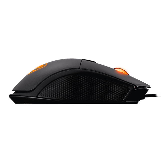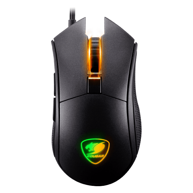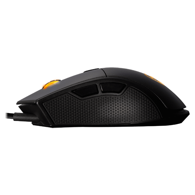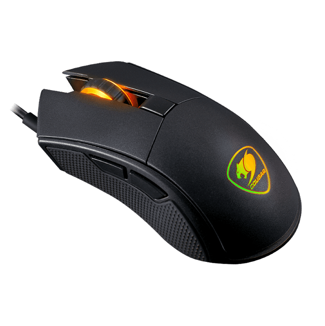 Флагман среди игровых девайсов компании Cougar. Манипулятор получил ассиметричный дизайн под правую руку. На корпусе расположено 5 кнопок с полноценными механическими переключателями, есть колесико прокрутки. В качестве сенсора использована оптика Pixart 3360, диапазон рабочего разрешения матрицы сенсора составляет 100-12 000 dpi. Управлять уровнем разрешения можно вручную, при этом пользователь может задать 5 значений DPI, а для переключения разрешения используется специальная кнопка, которая размещена над колесиком прокрутки. При помощи специализированного ПО можно осуществить тонкую настройку Cougar Revenger S. Программное обеспечение можно бесплатно загрузить с официального сайта производителя. Так, предусмотрена возможность переназначения и программирования кнопок, поддерживается создание макросов практически любой сложности. Манипулятор имеет собственную память, благодаря чему мышку получится задействовать на сторонних компьютерах без установки фирменного ПО и импорта профилей настроек. Основание мышки оснащено ножками легкого скольжения на основе тефлона. Масса девайса составляет всего 94 г (без учета провода).