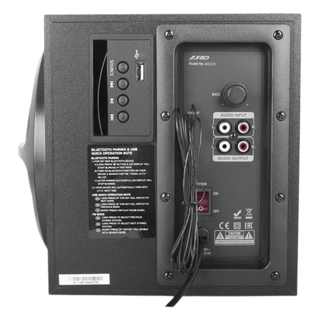 Колонки 2.1 F&D A111X – многофункциональная акустическая система, укомплектованная одним сабвуфером и двумя сателлитами. Особенностью модели является возможность Bluetooth-подключения. Беспроводными источниками звука могут являться смартфоны, мобильные телефоны, планшеты и другое оборудование. К USB-порту можно подключить флеш-накопитель. Тип проводного подключения – RCA. Имеется встроенный радиотюнер, который гарантирует высококачественный прием сигналов станций, ведущих вещание в диапазоне FM.