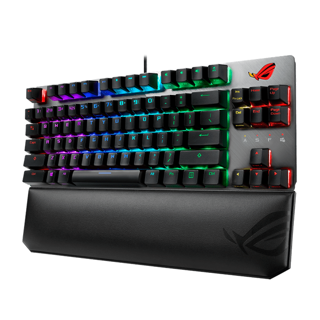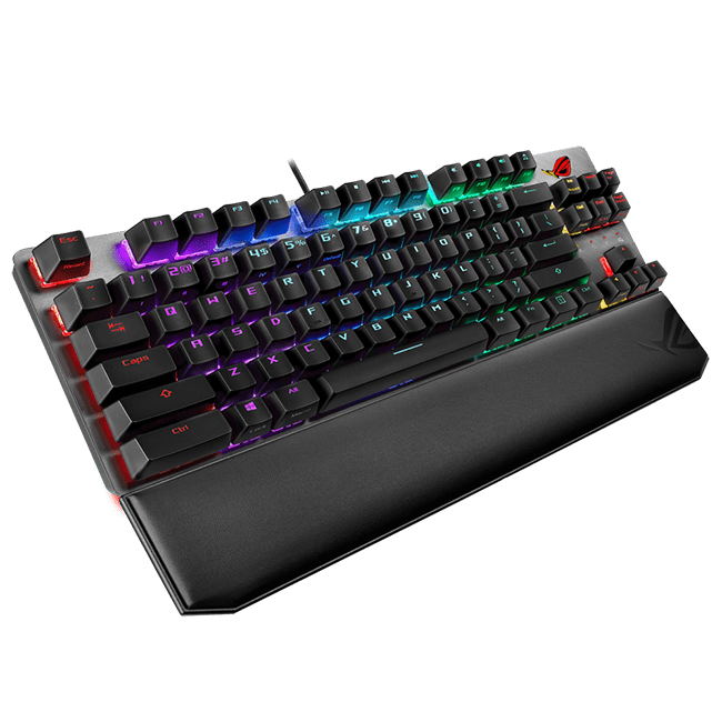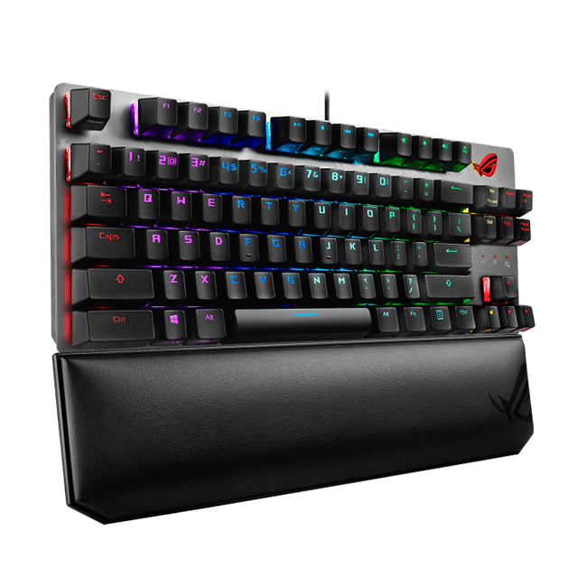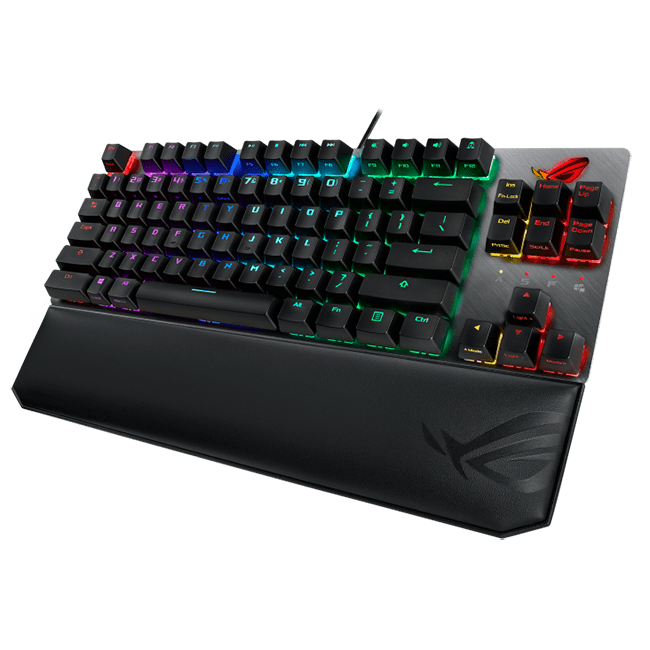 ROG Strix Scope TKL Deluxe [90MP00N5-BKRA00] — механическая проводная игровая клавиатура RGB для FPS игр, с переключателями Cherry MX, алюминиевой рамой, эргономичным упором для запястья и подсветкой Aura Sync.