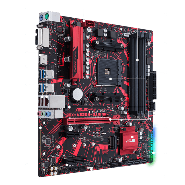 Материнская плата ASUS EX-A320M-GAMING сочетает в себе функциональность и миниатюрные размеры, что делает данное решение в формате Micro-ATX отличным выбором для сборки компактных игровых или рабочих компьютерных систем. Помимо этого модель отличается привлекательным внешним видом, который сочетает в себе первоклассные материалы, красно-черную расцветку и выразительные линии корпуса.