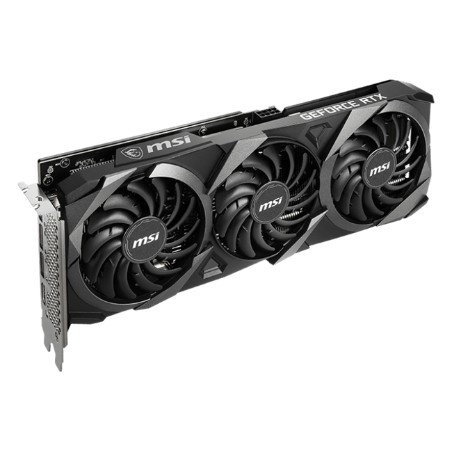 Видеокарта выделяется строгим оформлением в рамках линейки VENTUS. Три массивных вентилятора совместно с радиатором и тепловыми трубками эффективно отводит тепло от внутренних компонентов. Задняя сторона с металлической пластиной повышает прочность и устойчивость MSI GeForce RTX 3060 Ti VENTUS 3X к деформации. Для вывода изображения на монитор предусмотрены 3 разъема DisplayPort и 1 HDMI.