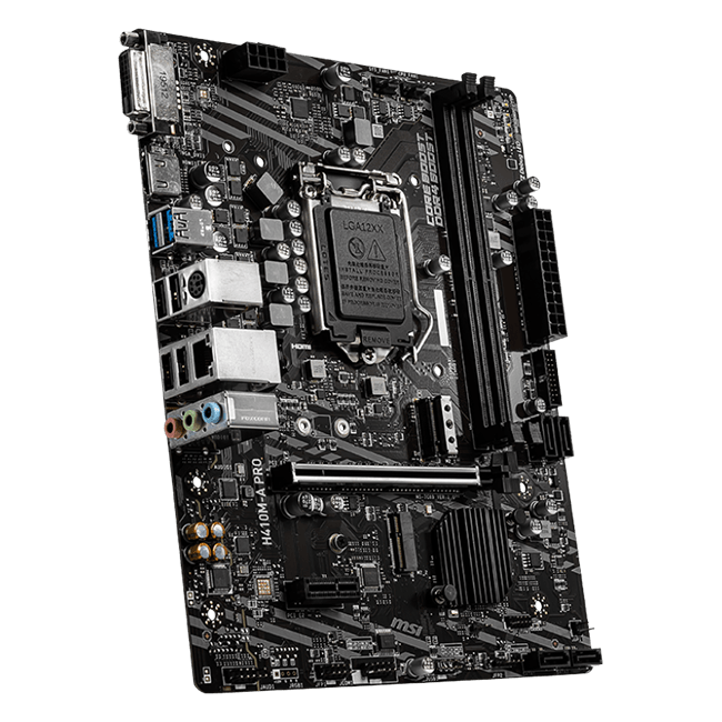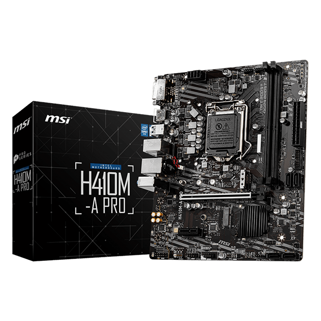 Материнская плата MSI H410M-A PRO гарантирует возможность создания компактного, но достаточно производительного стационарного компьютера. Устройство управляется чипсетом Intel H410, который позволяет по максимуму реализовать потенциал процессора, монтируемого в сокет LGA 1200. Сконструированная система может быть полезна дома и в офисе. Вы сможете организовать скоростную обработку данных: плата, имеющая поддержку стандарта NVMe, располагает разъемом M.2. Количество портов SATA – 4. Поддерживается SATA RAID нулевого уровня. Слотов расширения только два – PCI-E x16 и PCI-E x1. Если вы решите задействовать встроенное в процессор видео, то для вывода можно использовать порты DVI-D и HDMI.