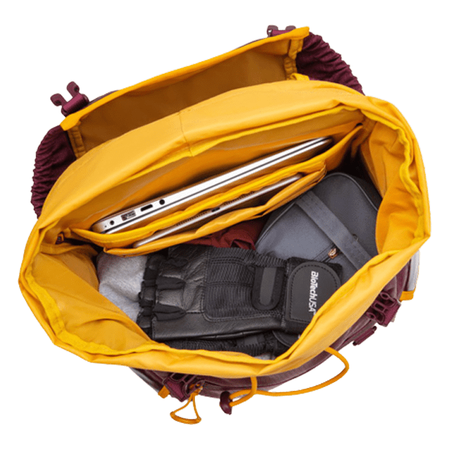 • Просторная секция для перевозки необходимых вещей, документов, спортивной формы затягивается шнуром и дополнительно закрывается на клапан с двумя пряжками.