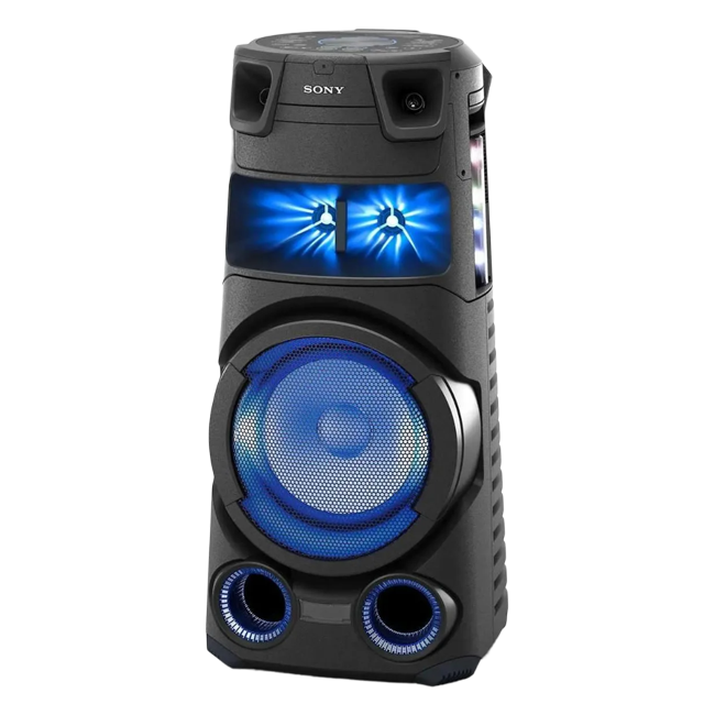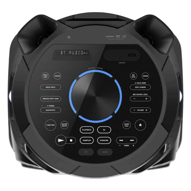 С помощью интегрированной подсветки, управляя лучами света синего, зеленого и голубого цветов, вы сможете создать атмосферу клубной вечеринки. Аудиосистема Sony MHC-V73D оснащена приводом CD/DVD, портом USB с поддержкой функции подзарядки, разъемом HDMI, выходами для микрофона и гитары, технологией Bluetooth, NFC, FM-тюнером. Расположенная на верхней части корпуса панель позволяет легко управлять функциями с помощью кнопок и жестов. Помимо этого, в комплекте поставляется пульт ДУ. Питание акустики осуществляется от электрической сети.