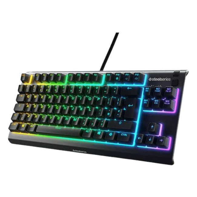 Устройство Steelseries Apex 3 TKL [64817] имеет 85 мембранных клавиш, работающих мягко и бесшумно. Клавиатура дополнена двумя клавишами мультимедиа, колесом прокрутки и рядом клавиш Fn. USB-кабель позволяет подключить устройство к ноутбуку, ПК и даже ТВ.